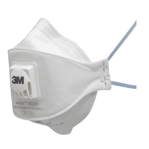 3M Aura 9322+ Flat-Fold Particulate Respirator. Advanced three-panel design and low breathing resistance Filter technology applied to the 3M Aura 9300+ series provides optimum comfort and easy communication, thus ensuring improved wearer acceptance even during long working hours. Being foldable they offer you more convenience than traditional cup shaped respirators. Its features include an embossed and sculpted top panel for improved compatibility with reduced fogging of eyewear and an innovative chin tab to improve the ease of fitting. Provides respiratory protection against moderate levels of fine dusts and mists. Low Breathing Resistance Filter Technology gives effective filtration with low breathing resistance for consistent high quality performance. Fold-Flat, easy to store, proprietary 3-panel design accommodates facial movement for wearer comfort. Individual hygienic packaging helps protect the respirator from contamination before use. 3M Cool Flow exhalation valve offers improved comfort in hot and/or humid environments and where work is physically demanding. Smooth inner cover-web and large soft nose foam for greater comfort against the skin. Even-tensioned straps relieve pressure for a comfortable and secure fit. Blue colour coded straps denoting FFP2 protection level. Standard: EN149:2001 FFP2 NR D, Approval: CE Marked, Assigned Protection Factor: 10.