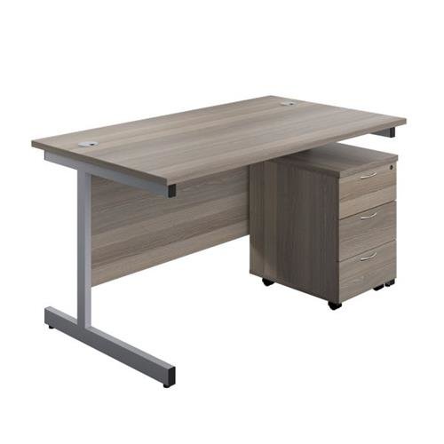 1400X800 Single Upright Rectangular Desk Grey Oak-Silver + Mobile 3 Drawer Ped