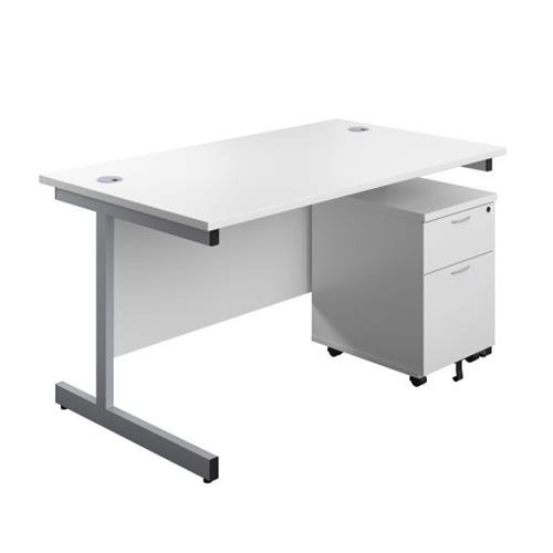 1400X800 Single Upright Rectangular Desk White-Silver + Mobile 2 Drawer Ped