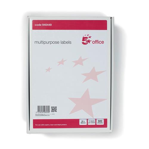 5 Star Office Multipurpose Labels Laser Copier Inkjet 14 per Sheet 99x38mm White 7000 Labels [Pack 500]
