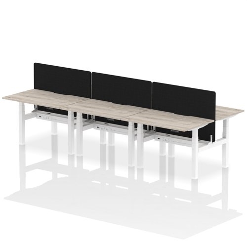 Air Back-to-Back 1200 x 800mm Height Adjustable 6 Person Office Bench Desk Grey Oak Top with Scalloped Edge White Frame with Black Straight Screen