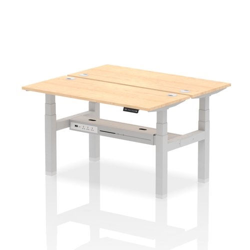 Air Back-to-Back 1400 x 600mm Height Adjustable 2 Person Office Bench Desk Maple Top with Cable Ports Silver Frame