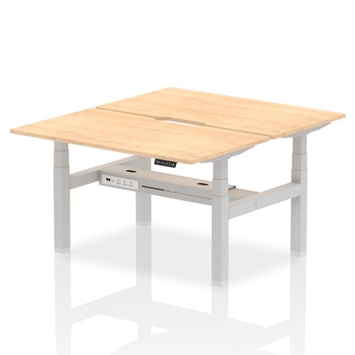 Air Back-to-Back 1400 x 800mm Height Adjustable 2 Person Office Bench Desk Maple Top with Scalloped Edge Silver Frame