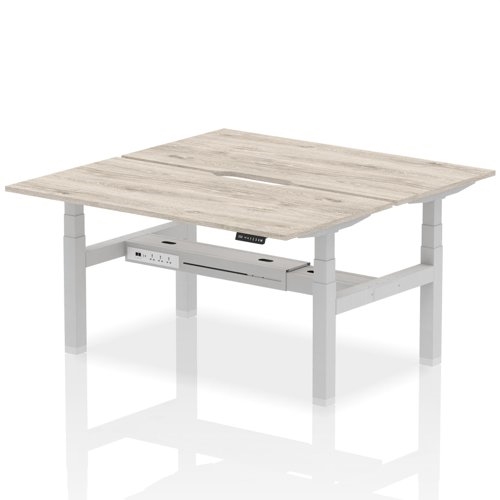 Air Back-to-Back 1600 x 800mm Height Adjustable 2 Person Office Bench Desk Grey Oak Top with Scalloped Edge Silver Frame