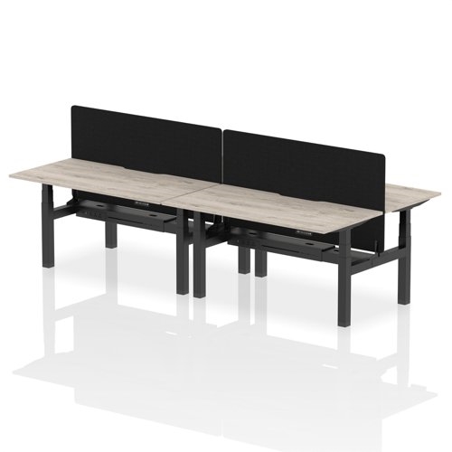 Air Back-to-Back 1600 x 800mm Height Adjustable 4 Person Office Bench Desk Grey Oak Top with Scalloped Edge Black Frame with Black Straight Screen