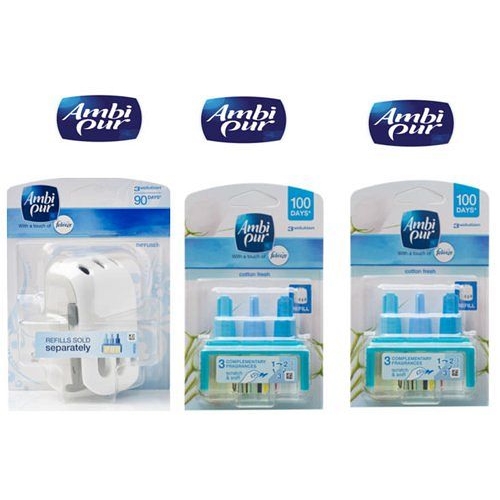 Breathe new life into your home or office with the clean fragrances of Ambi Pur Cotton Fresh 3volution. This clever plug-in air freshener uses 3 different complementary scents, which alternate every 45 minutes to keep your surroundings smelling glorious. This refill contains three 20ml cartridges, which together will last up to 90 days, when used for 12 hours per day at the minimum setting.