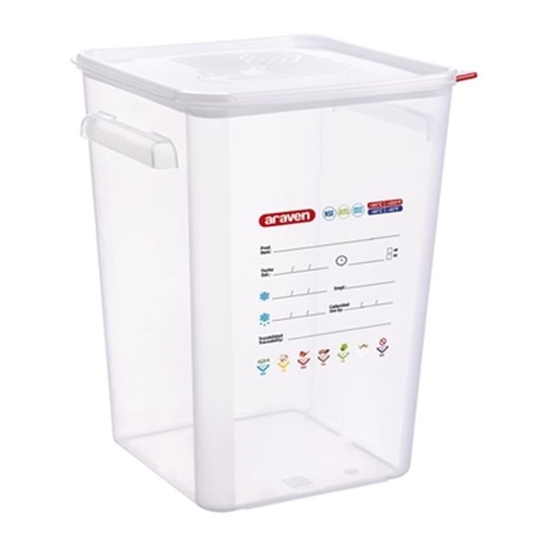 These 22-litre square airtight containers from Araven are ideal for storage of non-perishable goods. Supplied singly, they come with 7 ColorClips to prevent cross-contamination, build in traceability label, measuring scale and side handles for easy handling and transportation.