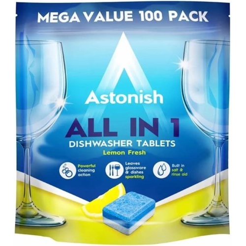 Astonish All In 1 Powerful Cleaning Dishwasher Tablets with Salt and Rinse Aid, Mega Pack of 100 Tablets, Lemon Fresh
