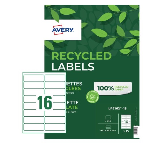 • Avery Laser Recycled Address Label 99.1x33.9mm 16 Per A4 Sheet White (Pack 240 Labels) LR7162-15