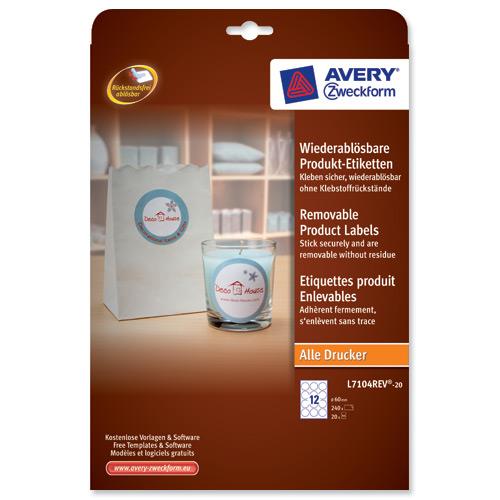 Avery Product Labels Removable 12 per Sheet 60mm Diameter White Circular Ref L7104REV-20.UK - 240 labels