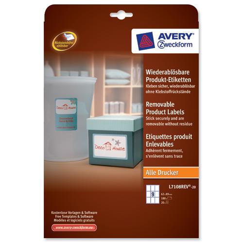 Avery Product Labels Removable 9 per Sheet 62x89mm White Rectangular Ref L7108REV-20.UK - 180 labels