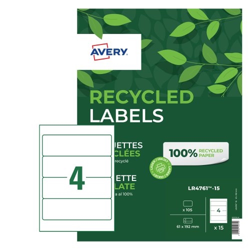 With Avery Recycled Filing Labels you can make a difference and help to protect the environment and label your lever arch files too! Not only are these labels made from 100% chlorine-free, bleached recycled paper but during the manufacturing process any waste material is completely recycled. Both the labels and packaging can be recycled with normal office waste. These recycled labels print with a sharp image and clear colours through your laser or inkjet printer every time. Ideal for labelling your wide lever arch files with a size of 61 x 192mm with 4 labels per sheet.