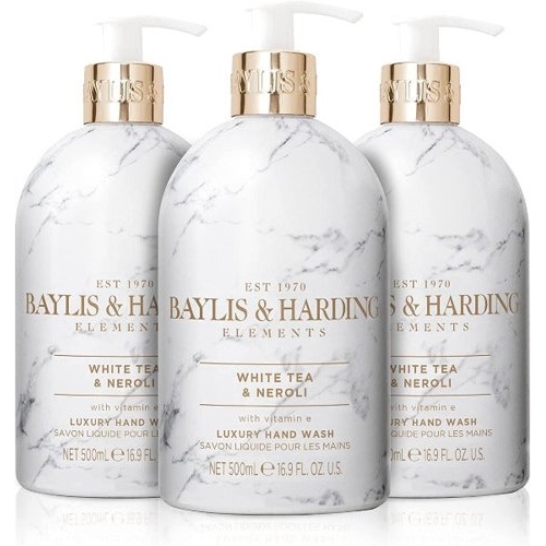 Elements from Baylis & Harding White Tea & Neroli 500ml Hand Wash. Fragrance of White Tea & Neroli in this simple but elegant new marble effect design inspired by the elements with sophisticated fragrance stories. Mouth watering and refreshing notes of citrus and pear are combined with a delicate rose and freesia bouquet on a bed of ambery woods, musks and tonka.