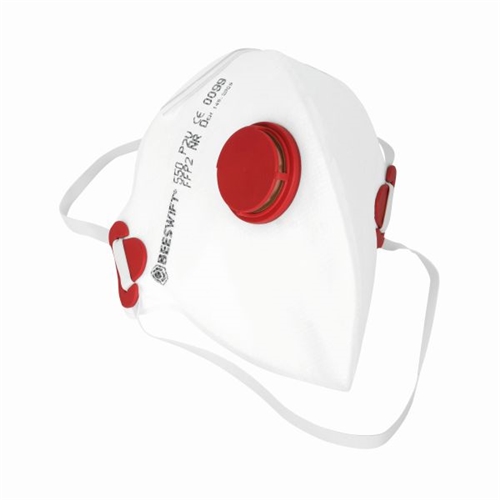 The Beeswift P2 valved respirator face mask has a vertical fold flat design. The mask has a Latex-free synthetic rubber head strap, and an adjustable nosepiece for comfortable face fit. Suitable for wearing with goggles or glasses. The P2 face mask offers low breathing resistance. This mask has high filtration capacity and is suitable for use when working around toxic dusts, fumes and water-based mists or for working with hardwood, glass fibres, plastic (non PVC) and some metalwork. The mask conforms to EN149:2001 + A1:2009 FFP2 NR V.