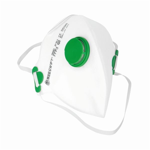 The Beeswift P3 valved respirator face mask is a maintenance free particulate respirator with a polypropylene (PP) outer layer that provides smooth lining and avoids loose fibres. The contour design ensures the compatibility of glasses/goggles and reduces fogging. A soft close-cell nose foam and adjustable nosepiece ensure custom shape and increase the worker comfort and acceptance. The P3V also has a latex-free synthetic rubber head strap. This mask has high filtration capacity and is suitable for use when working around fine toxic dusts, fumes and water-based mists or for working with hardwood, glass fibres, plastic (non PVC), metalworking and welding. The mask conforms to EN149:2001 + A1:2009 FFP3 NR V.
