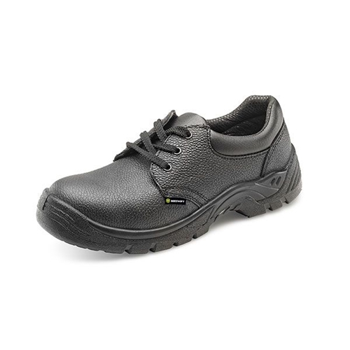 Beeswift S1 safety shoe with 200 Joule steel toe cap and midsole protection. Energy absorbing heel to help reduce the impact of the ground on the heel area. Anti-static outsole for extra safety. Oil and slip resistant outsole for extra grip. PU dual density with leather uppers and lace up fastenings. With a PU Padded collar and tongue. Meets Standard EN ISO 20345:2022 SBP E FO SR.