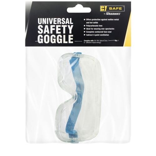 Beeswift Universal Safety Goggles have a Polycarbonate Lens, complete contoured face seal and indirect four point ventilation. Ideal for wearing over spectacles. The goggles offer protection against molten metal and hot solids. Conform to EN166:. Optical Class:1. B - (Medium impact energy).