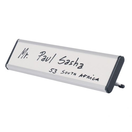 This handy desk nameplate features a convenient dryerase surface for easy updating and re-use. The smooth white surface is encased in a durable anodised aluminium housing and is ideal for receptions, counters, desks, and during meetings and conferences. The nameplate measures W220 x D20 x H60mm.