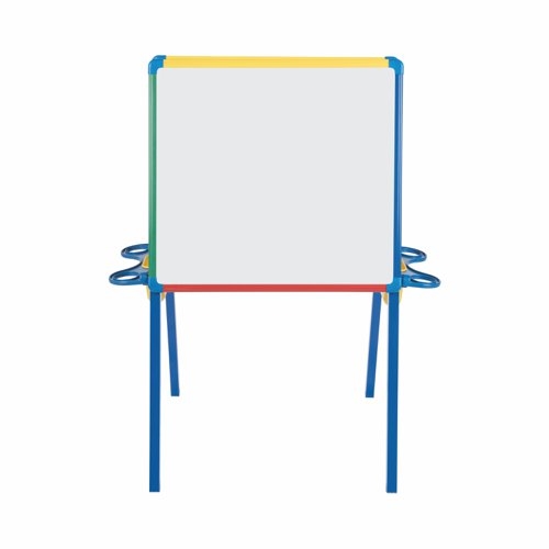 Learning can be fun with the Bi-Office Schoolmate Magnetic Whiteboard Easel. The lacquered steel surfaces are suited for frequent use with a 10 years lifespan. Thanks to both dry wipe surfaces, it's ok to try and make mistakes, as they can erase and just start again. Pictures and other items can be posted with magnets. They can also write and draw on paper sheets to be hung on the top hooks. It can be used in many ways from developing writing readiness and preparing children for pencil and paper, to playing learning games to consolidate understanding. Also, this easel is great for standing hands-on and fun play experience. Besides, it ensures group activities and student connections in an engaging setting. Its coloured round edges and corners make this lightweight yet resistant easel a safe and engaging method for kids to develop finger dexterity and good pencil grip. Just fold the A-frame flat when they're done and store it away. The set includes cups for accessories like dry wipe markers and others on both sides of the easel.