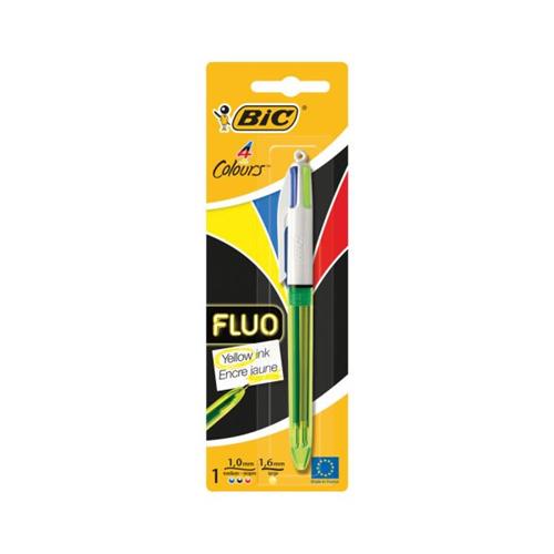 The Bic Fluo Pen offers the ultimate versatility for note-taking and research. It contains 3 ball pens in blue, black and red ink, and one yellow Fluo pen for highlighting text. It comes in a transparent yellow barrel with retractable nibs for easy colour changing.