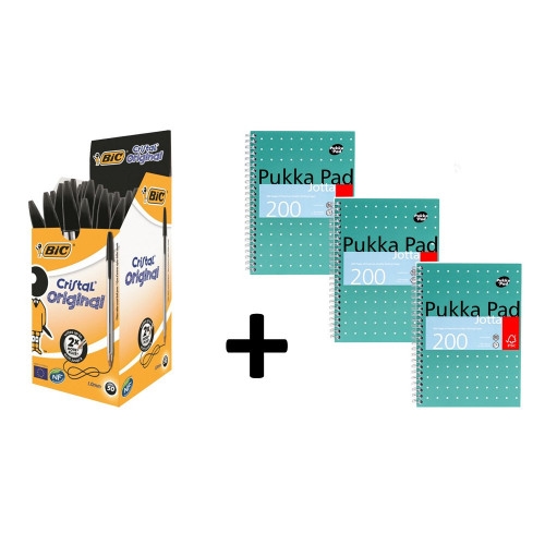 When you purchase this product you will receive one pack of fiftyblack Bic Cristal ballpoint pens and a FREE pack of three Pukka Metallic Jotta Pads.