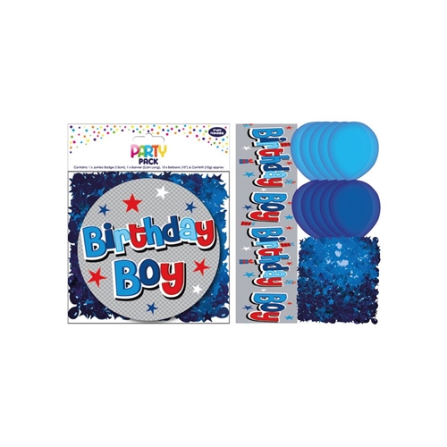 Everything you need to celebrate the birthday boy. This set includes blue balloons, a 2.4m 'Birthday Boy' banner, balloon and star confetti and a 15cm 'Birthday Boy' jumbo badge.