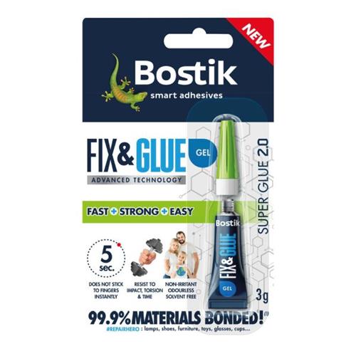 This Bostik Fix and Glue is a fast, strong adhesive, which bonds most materials. The gel formulation is impact and torsion resistant for a long lasting, secure bond. The super glue is solvent free, odourless and non-irritating. Ideal for plastic, glass, soft furnishings, crockery and more, the glue dries clear in just 5 seconds. This pack contains 1 x 3g tube.