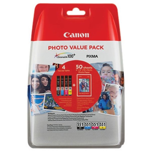 Enjoy the convenience of a photo value pack that bundles Cyan/Magenta/Yellow/Black CLI-551 7ml ink tanks with 50 sheets of 4x6 inch Photo Paper Plus Glossy II for your PIXMA.