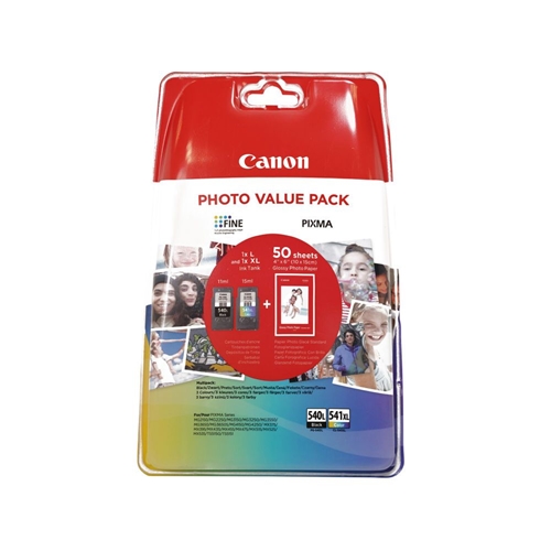 Print your documents and photos with a convenient value pack that includes PG-540L Black and CL-541XL Colour ink cartridges as well as 50 sheets of 10x15 cm Glossy Photo Paper for your PIXMA printer. Print up to 300 pages with the 11ml black ink cartridge and up to 400 pages with the 15ml colour ink cartridge at ISO/IEC 24711 standard. Compatible with PIXMA MG2150, MG2250, MG3150, MG3250, MG3550, MG3650, MG3650S, MG4150, MG4250, MX375, MX395, MX435, MX455, MX475, MX515, MX525, MX535, TS5150, TS5151.