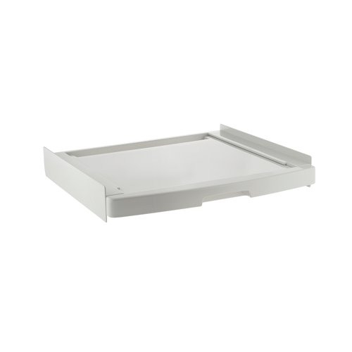 Universal Stacking Kit with sliding shelf. Stable and secure space saving design for all standard sizes of washing machines and tumble dryers. The practical sliding shelf, with a safe stop and anti-tipping system, holds up to 12kg and makes loading and unloading easier.