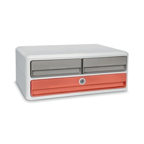 The Terra Nova Moovup Unit is an ultra-sturdy module to support your screen (up to 5kg) and promote good posture. It has 2 half-drawers for storing your office supplies (pens, calculator, A5 notepad, etc.) and computer accessories (external hard drive, USB stick, mouse, etc.). Positioned at the top for easy access above your keyboard. 1 large drawer for documents up to 24x32 cm in size, tablets and laptops up to 14 inches. Perfect smooth sliding drawers with retaining stop. GDPR compliant, the lock secures all 3 drawers and a rear port allows installation of an anti-theft security cable (not supplied).