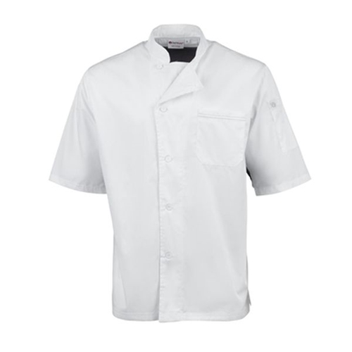 Contemporary chefs coats with cool vent technology under arm and back panels. Contrast topstitching and side seam slits.