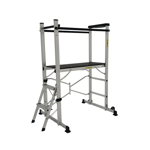The Climb-It Folding Work Platform has an aluminium folding work platform with a large, anti-slip, standing surface. There are steel handrails either side of the platform for increased safety. Adjustable stabilisers allow the unit to be positioned close to a wall or working areas. Perfect for those tough to reach jobs. The work platform easily folds for ease of movement, it will fit through doorways and narrow aisles. The unit comes complete with a built-in tool holder. The platform has a weight capacity of 150kg.