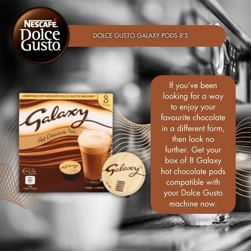 If you've been looking for a way to enjoy your favourite chocolate in a different form, then look no further. Get your box of 8 Galaxy hot chocolate pods compatible with your Dolce Gusto machine now.