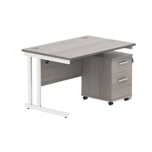 Double Upright Rectangular Desk + 2 Drawer Mobile Under Desk Pedestal 1200X800 Alaskan Grey Oak/White