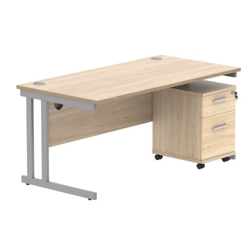 Double Upright Rectangular Desk + 2 Drawer Mobile Under Desk Pedestal 1600X800 Canadian Oak/Silver
