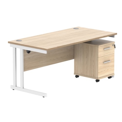 Double Upright Rectangular Desk + 2 Drawer Mobile Under Desk Pedestal 1600X800 Canadian Oak/White