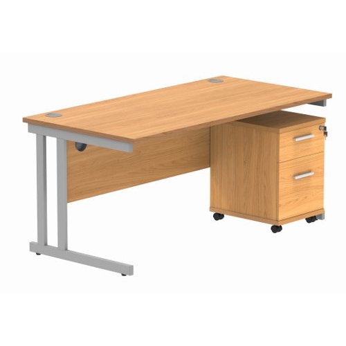 Double Upright Rectangular Desk + 2 Drawer Mobile Under Desk Pedestal 1600X800 Norwegian Beech/Silver
