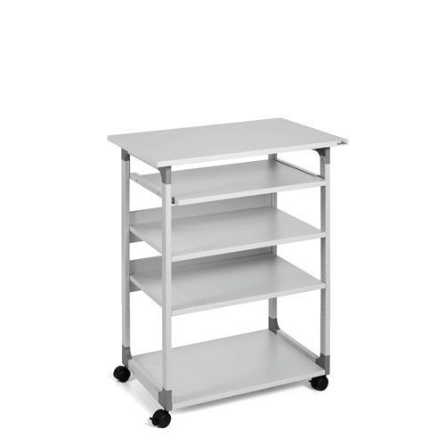 Introducing Durable’s Mobile Computer Table – the perfect solution for busy workspaces needing quick access to computer equipment. This versatile workstation features four durable shelves two of which are height-adjustable providing flexible storage options for various office essentials.