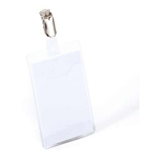 Transparent portrait hard PVC plastic name badges with a partial cover for quickly changing inserts. They feature a rotating clip fastener to keep the badge sitting vertically and a clip cut-out for combination with chains, badge reels and lanyards.