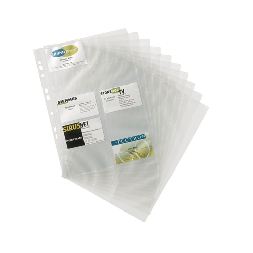 Durable A4 polypropylene pockets, for up to 200 business cards (54x90mm), are multi-punched for all ring binders and files. For use as replacement or extension pockets to keep business cards stored in an orderly fashion. Supplied in a pack of 10.