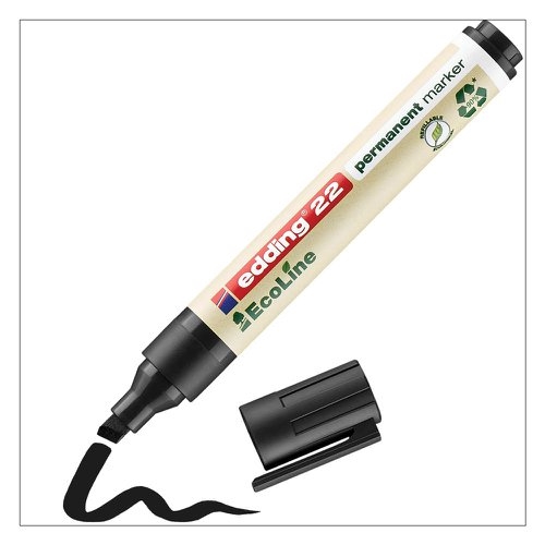 The Edding 22 Ecoline permanent marker is designed for marking and labelling almost all materials, including: paper, cardboard, metal, plastic and glass. With at least 90% of the plastic made from recycled materials and 83% of it is post-consumer, it is Climate neutral in accordance with ClimatePartner-ID 13742-1910-1001. The chisel tip has a stroke width of 1-5mm with waterproof ink which is wear-resistant on almost all surfaces. Fully refillable with the Edding MTK 25 refill service and Edding T 25, T 100 and T 1000 refill inks which are low-odour and without added toluene/xylene. Suplied in a pack of 10 black markers.