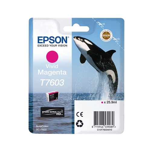 Epson T7603 Ink Cartridge Ultra Chrome HD Killer Whale Vivid Magenta C13T76034010. Page yield: up to 1,400. Compatible with SureColor SC-P600 inkjet printers.