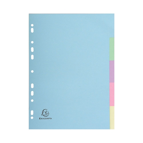 These environmentally friendly Exacompta A4 dividers are made from 100% recycled 170gsm pastel card. This 5-part set comes in attractive pastel colours and is multipunched for filing in standard ring binders and lever arch files.