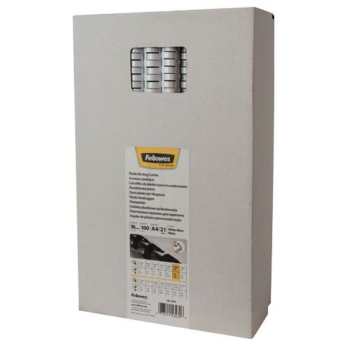 Fellowes Plastic Binding Combs 21 ring with a comb length of 30cm. Colour - White 16mm (101-120 80g sheet capacity). Pack 100.