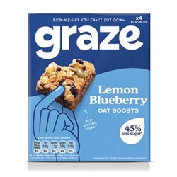 Graze Lemon and Blueberry Oat Boosts are lemon and blueberry flavoured wholegrain oat and mixed seed flapjacks. Providing a source of manganese for energy-yielding metabolism, these 30g bars are supplied in a pack of 4.