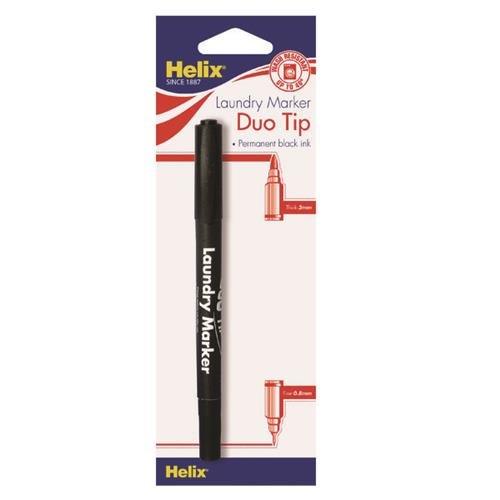Helix Laundry Marker Twin Tip Permanent marker in black supplied in a pack. Drawing and writing on clothes is made incredibly easy with the Helix Laundry Marker with the twin tip providing both a 3mm line width for bold writing and a 0.8mm line width for more fine writing needs. The ink is permanent and is also wash resistant up to 40 degrees. This pack contains 10 pens.