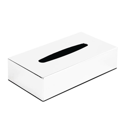Chromed ABS rectangular tissue box holder with fitted base, suitable for wall mounting (fixings not included) or free-standing use in hotel rooms, bathrooms and washrooms.