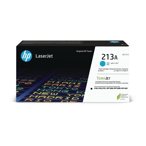 This HP 213A Original Laser Toner Cartridge is for use with Color LaserJet Enterprise Flow MFP 6800zfsw, 6800zfw+, 6801zfsw, 6801zfw+, Enterprise MFP 5800dn, 5800f and 6800dn printers. This toner cartridge has a print yield of up to 3,000 pages. This pack contains 1 cyan laser toner cartridge.