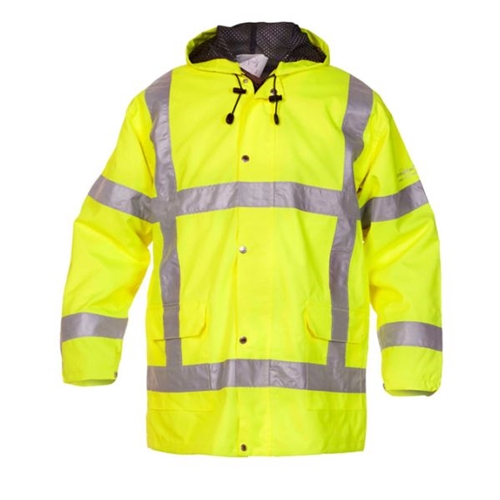 The Hydrowear Uitdam SNS High Visibility Waterproof Jacket has a concealed zip front with storm flap cover and press stud closure. Complete with a fixed hood and draw cord, 2 front pockets with storm flap, mesh polyester lining. Not compatible with the Weert quilted lining and Franeker High Visibility Fleece. Simply no Sweat (SNS) 210gsm Polyester laminate fabric. Highly breathable providing great comfort. Durable and cost effective. Smooth textile finish. Conforms to EN ISO 20471:2013 Class 3 High Visibility. Conforms to EN343:2003+A1:2007 Class 3:3. Conforms to EN ISO 13688:2013 General requirements for protective clothing.